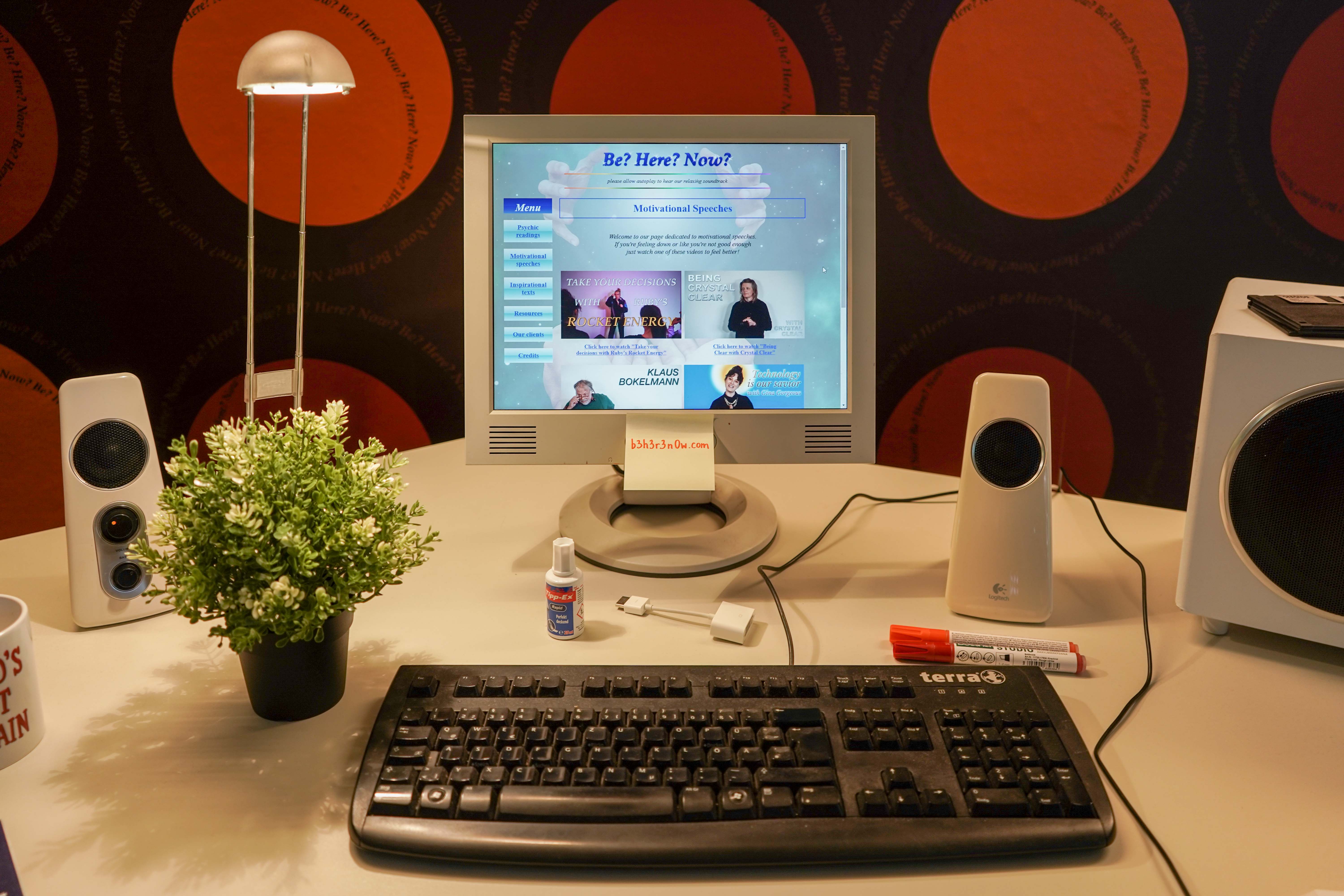Through a collection of resources assembled into a single website and displayed in the setting of a spatially elusive office space, “Be? Here? Now?” speaks to the emergence of mindfulness culture, specifically the emphasis it places on a "presentness" of consciousness mediated through technology. Through a collection of materials and reenactments presented on the website and inspired by the kitsch design of the 1990s and early 00s, the project creates a humorous collective reflection that is ultimately questioning what it means to have a "real" relationship in which one is "present".