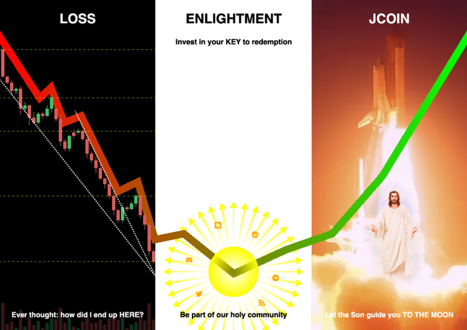 Faith and money are not to be antigonised anymore. JCOIN (JC) is your safest bet to get closer to God. Join our community of faithful forward-thinking christians and own your own piece of the Son.